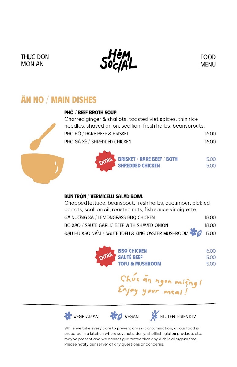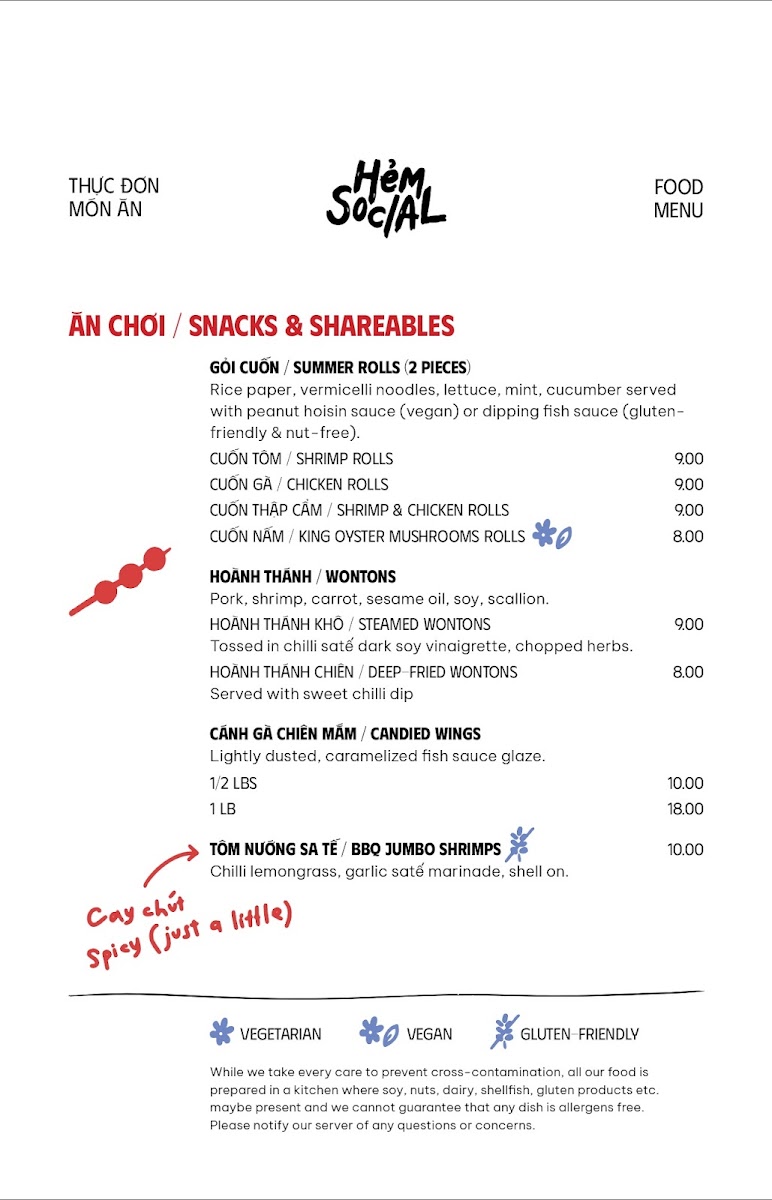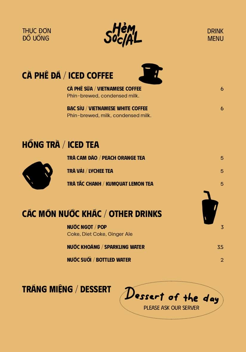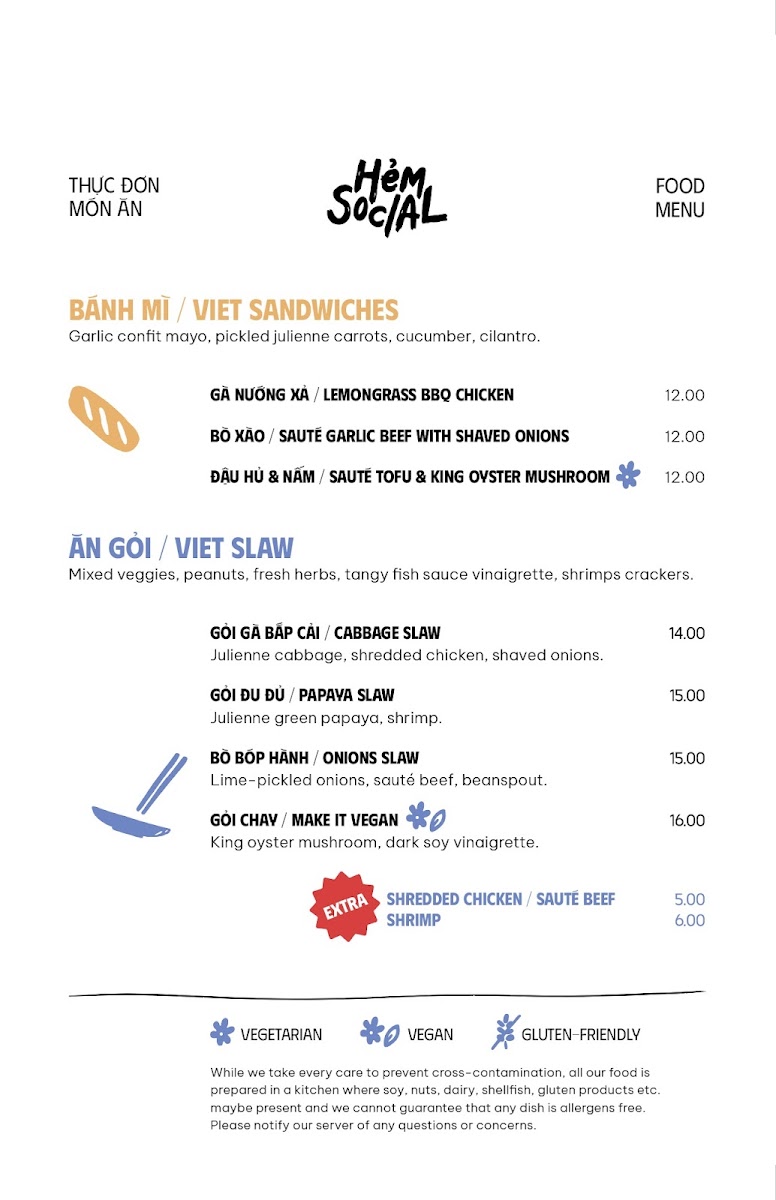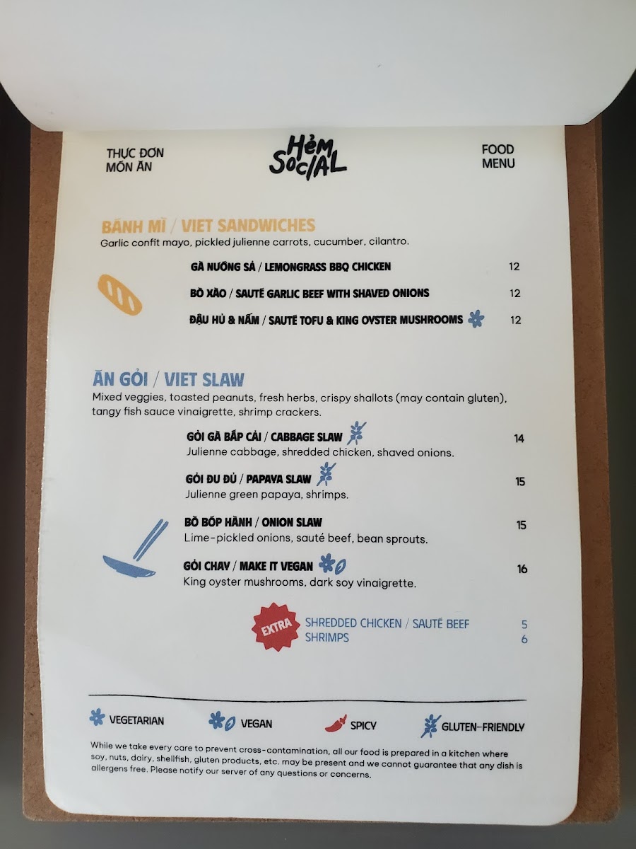 From a reviewer’s perspective, Hem Social’s menu offers a vibrant exploration of Vietnamese flavors, balancing classic comfort dishes with thoughtful plant-based options. The Viet Slaw / An Gỏi selections-Sauté Beef & Onion Slaw / Bò Bóp Hành, Shrimp Papaya Slaw / Gỏi Đu Đủ, Chicken Cabbage Slaw / Gỏi Gà Bắp Cải, and Make It Vegan / Gỏi Chay-set a fresh, tangy tone for the meal. Their Viet Sandwiches / Bánh Mì, including Sauté Garlic Beef Sandwich With Shaved Onions, Lemongrass BBQ Chicken Sandwich, and Sauté Tofu And King Oyster Mushroom Sandwich, offer approachable yet flavorful options ideal for lunch or a casual bite. For heartier fare, the Main Dishes / Ăn No category delivers satisfying bowls: Sauté Tofu And King Oyster Mushrooms Vermicelli Bowl / Đậu Hủ Xào Nấm (Vegan), Lemongrass BBQ Chicken Vermicelli Bowl / Gà Nướng Sả, and Sauté Garlic Beef With Shaved Onions Vermicelli Bowl / Bò Xào, as well as comforting soups like Rare Beef And Brisket Pho Soup / Phở Bò and Shredded Chicken Pho Soup / Phở Gà Xé. For sharing or snacking, the An Chơi options are a highlight, featuring Shrimp Rolls / Cuốn Tôm, BBQ Sate Shrimps / Tôm Nướng Sa Tế, King Oyster Mushroom Rolls / Cuốn Nấm (Vegan), Deep-Fried Wontons / Hoành Thánh Chiên, and Candied Wings / Cánh Gà Chiên Mắm. Complementing these dishes, the beverage lineup ranges from Pop / Nước Ngọt and Coconut Water / Nước Suối to Sparkling Water / Nước Khoáng, with iced drinks like Kumquat Lemon Tea / Trà Tắc Chanh, Lychee Tea / Trà Vải, and Vietnamese coffee options including Vietnamese Coffee / Cà Phê Sữa, Vietnamese White Coffee / Bạc Sỉu, and Sea Salt Foam Vietnamese Coffee / Cà Phê Muối. Overall, Hem Social’s menu is a well-curated mix of fresh, savory, and indulgent flavors that cater to a wide range of tastes, from vegan-friendly bowls to classic meaty favorites, making it a versatile spot for both casual dining and small-group sharing.
