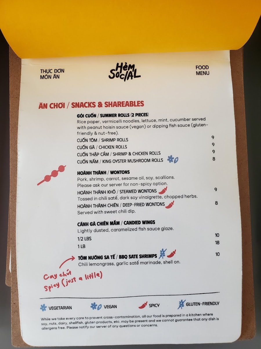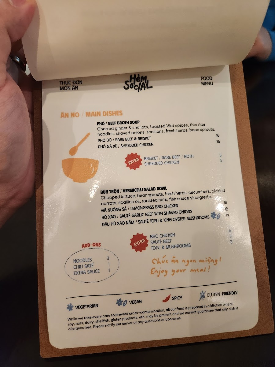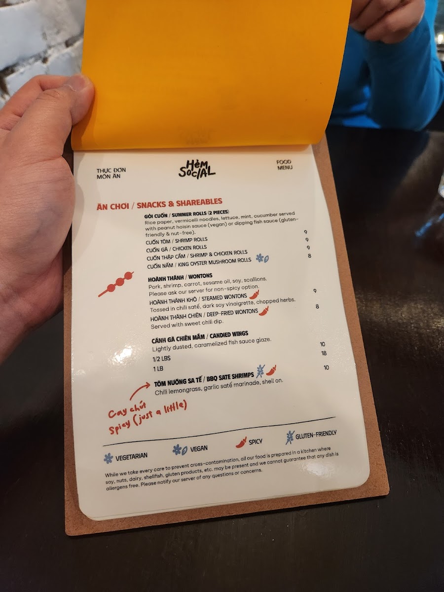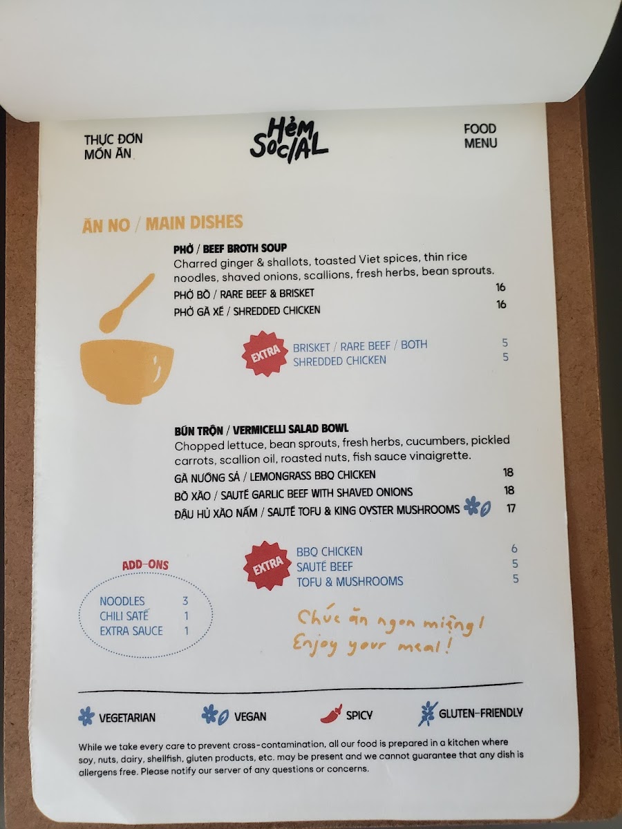 From a reviewer’s perspective, Hem Social’s menu offers a vibrant exploration of Vietnamese flavors, balancing classic comfort dishes with thoughtful plant-based options. The Viet Slaw / An Gỏi selections-Sauté Beef & Onion Slaw / Bò Bóp Hành, Shrimp Papaya Slaw / Gỏi Đu Đủ, Chicken Cabbage Slaw / Gỏi Gà Bắp Cải, and Make It Vegan / Gỏi Chay-set a fresh, tangy tone for the meal. Their Viet Sandwiches / Bánh Mì, including Sauté Garlic Beef Sandwich With Shaved Onions, Lemongrass BBQ Chicken Sandwich, and Sauté Tofu And King Oyster Mushroom Sandwich, offer approachable yet flavorful options ideal for lunch or a casual bite. For heartier fare, the Main Dishes / Ăn No category delivers satisfying bowls: Sauté Tofu And King Oyster Mushrooms Vermicelli Bowl / Đậu Hủ Xào Nấm (Vegan), Lemongrass BBQ Chicken Vermicelli Bowl / Gà Nướng Sả, and Sauté Garlic Beef With Shaved Onions Vermicelli Bowl / Bò Xào, as well as comforting soups like Rare Beef And Brisket Pho Soup / Phở Bò and Shredded Chicken Pho Soup / Phở Gà Xé. For sharing or snacking, the An Chơi options are a highlight, featuring Shrimp Rolls / Cuốn Tôm, BBQ Sate Shrimps / Tôm Nướng Sa Tế, King Oyster Mushroom Rolls / Cuốn Nấm (Vegan), Deep-Fried Wontons / Hoành Thánh Chiên, and Candied Wings / Cánh Gà Chiên Mắm. Complementing these dishes, the beverage lineup ranges from Pop / Nước Ngọt and Coconut Water / Nước Suối to Sparkling Water / Nước Khoáng, with iced drinks like Kumquat Lemon Tea / Trà Tắc Chanh, Lychee Tea / Trà Vải, and Vietnamese coffee options including Vietnamese Coffee / Cà Phê Sữa, Vietnamese White Coffee / Bạc Sỉu, and Sea Salt Foam Vietnamese Coffee / Cà Phê Muối. Overall, Hem Social’s menu is a well-curated mix of fresh, savory, and indulgent flavors that cater to a wide range of tastes, from vegan-friendly bowls to classic meaty favorites, making it a versatile spot for both casual dining and small-group sharing.